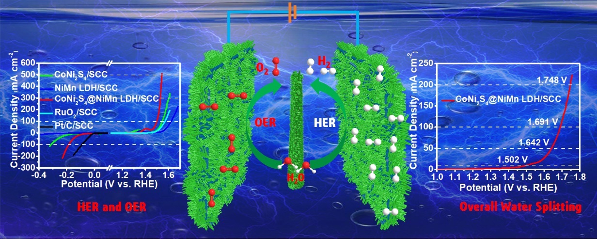 (2) Then, the research team found thatNi-Cobimetallic sulfides have shown excellent HER properties, but are oxidized at the oxygen evolution anode potential and becomes unstable as a result of sulfur atoms removement from the catalyst. LDH is a kind of OER catalyst with high activity and stability, but its weak conductivity limits its activity. Therefore, when Ni-Co sulfides and LDH are combined, the high conductivity of the former and the high stability of later can be used to compensate their shortcomings to finally achieve high activity towards water splitting. Since it has been reported that Mn can enhance the intrinsic activity of OER by adjusting the electronic structure of FeOOH, NiMn LDH may be a good substitute for the widely used NiFe LDH targeting at higher OER activity. In addition, the electrode can effectively contact the electrolyte as the reactant, which can accelerate the mass transfer and improve the catalytic activity. Based on the above strategies, a hierarchicalCoNi2S4@NiMn LDHheterostructure nanowire array was loaded onto a super hydrophilic carbon cloth. The heterostructures of theCoNi2S4@NiMn LDH not only combine the excellent intrinsic activities of theCoNi2S4nucleus and theNiMn LDHshell, but also compensate their shortcomings and enhance the conductivity and stability. The catalyst shows excellent activity and stability for HER, OER and OWS. For example, when it is used as both cathode and anode in the OWS, achieving current density of 10,50,100 and 200mA cm–2requires only 1.502,1.642,1.691 and 1.748 V of applied cell voltage, respectively. Such high activity is competitive among most non-noble metal catalysts at present. The work was published in the Electrochimica Acta (), entitled “Hierarchical CoNi2S4@NiMn-layered double hydroxide heterostructure nanoarrays on superhydrophilic carbon cloth for enhanced overall water splitting”.