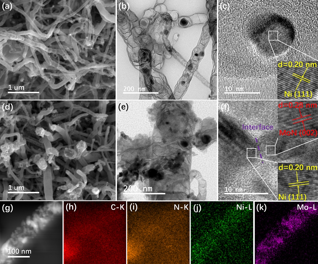 (1) Recently, they found that molybdenum nitride has been widely used as a catalyst for hydrogen evolution due to its catalytic properties similar to those of noble metals (VIII). However, it is still a challenge to improve the catalytic activity and stability of molybdenum nitride. A practical solution is to integrate molybdenum nitride with other functional materials to improve its catalytic performance. Ni-based materials are effective catalysts for OER. The composite of molybdenum nitride and Ni-based materials may improve the activity of the catalyst towards HER and OER. Besides, nano-sized catalysts tend to aggregate and reduce their catalytic activity during stability testing, which can be solved by anchoring or encapsulating them in carbon materials. Based on this assumption, the research team reported a new method for the synthesis of nitrogen-doped carbon nanotubes with Ni/MoN heterostructure on the surface of carbon cloth. Physical characterization and electrochemical test results show that the obtained catalyst has excellent HER, OER and overall water splitting (OWS) performance. This work provides a new strategy to construct a large surface area three-dimensional heterogeneous structure of the water decomposition catalyst. The work was published in the ChemElectroChem 2020,7,745-752 entitled “N-doped Carbon Nanotubes Encapsulating Ni/MoN Heterostructures Grown on Carbon Cloth for Overall Water Splitting”.