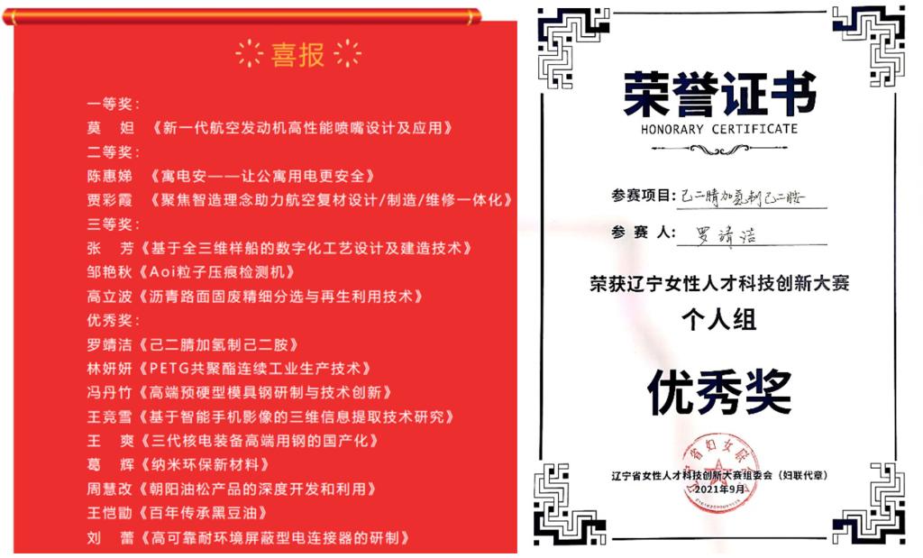 近日,为贯彻落实习近平总书记在中央人才工作会议上关于科技创新的重要讲话精神,我省举办首届辽宁女性人才科技创新大赛,并于9月29日举行颁奖仪式。经过初赛及决赛的激烈角逐,化工学院梁长海教授课题组-罗靖洁副教授以“己二腈加氢制己二胺”参赛项目入围个人组优秀奖(排序第一)。