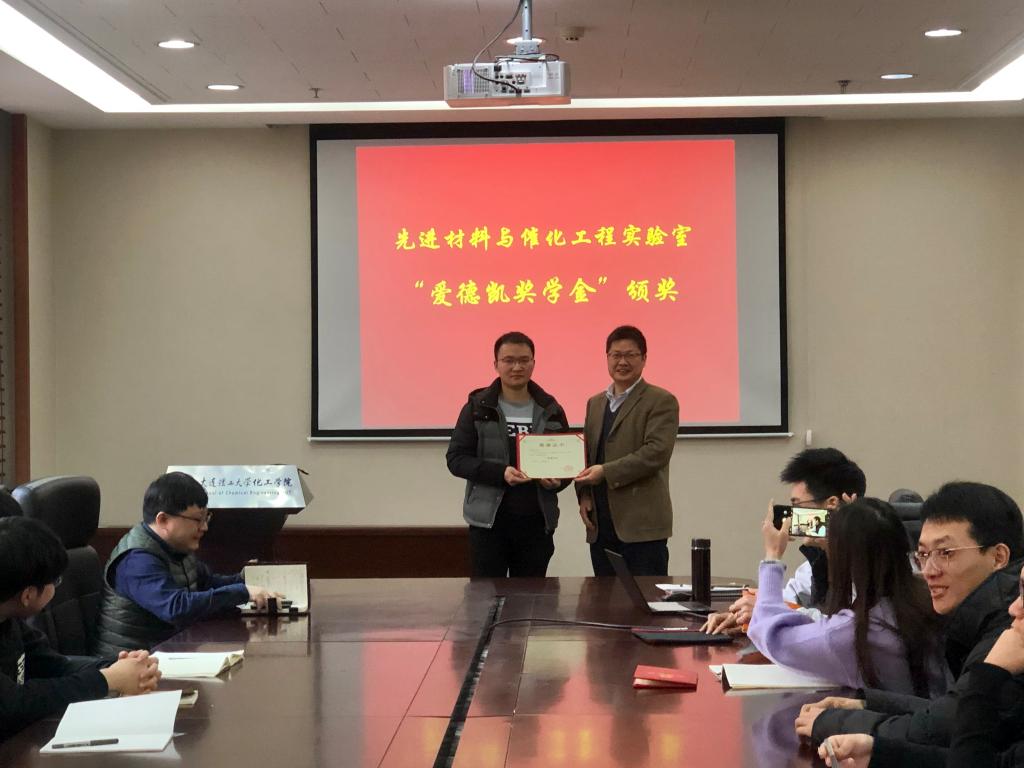 同时,进行先进材料与催化工程实验室“爱德凯奖学金”颁奖仪式。由梁长海教授与李闯副教授分别为获得一、二等奖学金的优秀研究生颁发获奖证书。本次奖学金由大连爱德凯科技有限公司设立,一等奖学金一项,二等奖学金四项,优秀奖学金多项,奖学金总金额达五万元。课题组博士研究生孟记朋荣获一等奖学金5000元;博士研究生牛鸿宇和凌雨、硕士研究生崔天云和刘鹏程荣获二等奖学金3000元/人,其他同学荣获优秀奖学金。
