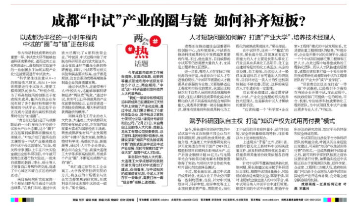 近日,成都商报针对两会热点话题对梁长海教授等人进行访问。新闻称,梁长海教授带领团队,面向国家重大需求和国家经济主战场,聚焦成都新型材料产业发展需求和“卡脖子”技术突破,在聚合物材料单体、高端化学品、新能源等领域引入市外企业资金,联合市内企业产业,衔接大连理工大学等多家高校院所,正不断形成多个产业“圈”,持续延长成都产业的“链”。