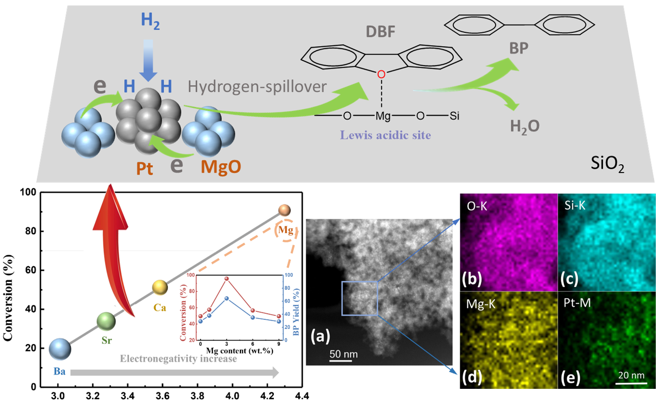 近日,大连理工大学梁长海教授的先进材料与催化工程课题组,在生物质催化氢解领域取得重要研究成果。课题组研究人员通过氧化镁修饰传统贵金属铂基催化剂,有效促进C-O键断裂并抑制芳烃产物的过度加氢。并从微观结构及表界面组成等方面深入解析MgO助剂对模型分子二苯并呋喃加氢制备芳烃的催化活性及选择性的调控机制。研究表明,MgO与SiO2载体表面形成Si-O-Mg结构,生成路易斯酸性位点,促进底物中富电子含氧基团的吸附。同时,MgO的表面修饰有效增强载体碱性,促进产物联苯脱附,有效抑制过度加氢反应的发生。电荷由铂原子簇周围MgO转移至铂原子,促进氢气解离并稳定铂物种,在反应240小时后催化剂活性仍保持稳定。然而,过量的MgO会阻碍氢溢流,降低反应活性。随后,课题组成员进一步对同主族碱土金属(镁、钙、锶和钡)对Pt基催化剂的修饰作用进行探讨,其加氢反应性能与修饰金属的电负性正线性相关。相关研究成果发表在催化领域顶级期刊Journal of Catalysis (2019, 371, 346-356)上。