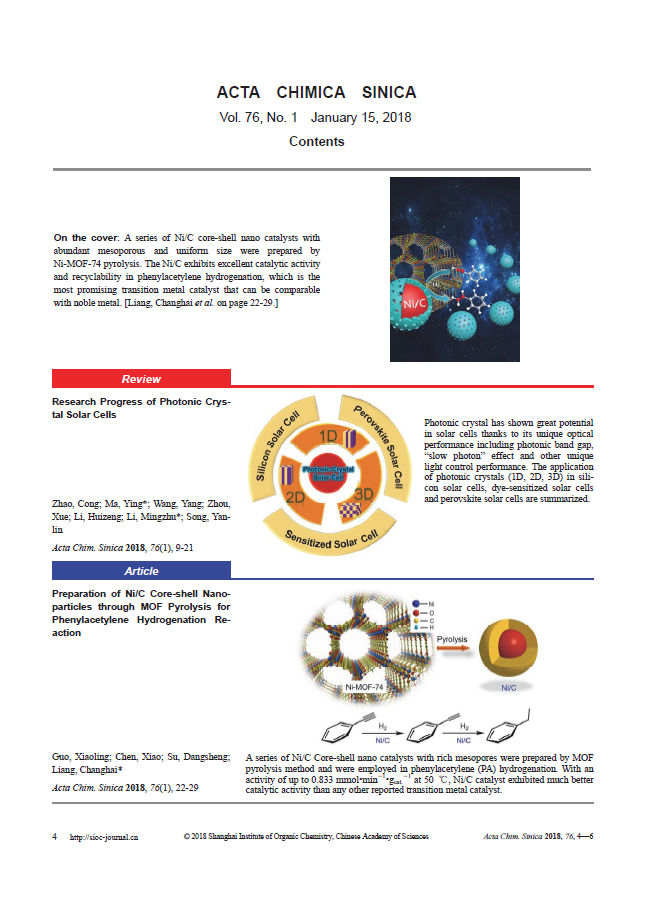 近日,我校石油与化学工程学院梁长海教授 “先进材料与催化工程”研究组,在纳米核壳选择加氢催化剂研究取得重要新进展。郭小玲博士为第一作者的研究论文 “MOF热解法制备Ni/C核壳材料及其催化苯乙炔加氢性能研究”发表在中国化学会的《化学学报》(Acta Chimica Sinica, 2018, 76(1), 22–29) 杂志上,并被选为2018年第1期封面进行重点报道。