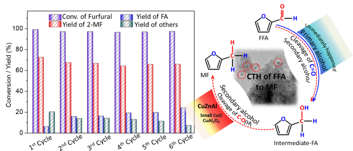近日,梁长海教授的先进材料与催化工程团队采用过渡金属基CuZnAl催化剂,以醇类作为氢供体,在常压条件下实现高选择性催化氢转移还原糠醛制备2-甲基呋喃。CuZnAl催化剂表现出优异的氢解离性能、2-甲基呋喃选择性及稳定性。研究结果发现以异丙醇等仲醇作为溶剂及氢源,能够有效避免脱羰基及呋喃环加氢等副反应的发生。同时,CuZnAl催化剂前驱体中CuO与CuAl2O4晶相同时存在,有利于前驱体氧化还原性能及氢解离性能的提高。另外,Cu-Zn物种间的协同作用有效调控催化氢转移还原糠醛的产物分布。当CuZn原子比为 2.5:1时,600 oC焙烧的Cu2.5Zn-Al-600催化剂经过H2预处理后,在180 oC及N2常压条件下反应4 h,糠醛转化率高达99%,2-甲基呋喃收率达可达72%,经过6次循环反应,糠醛转化率及2-甲基呋喃收率基本保持稳定。相关工作为绿色、低成本CuZnAl催化剂在糠醛生产2-甲基呋喃及呋喃产业中的应用提供了可能。