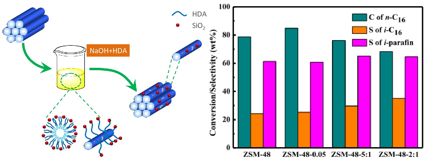 ZSM-48分子筛富含十元环(0.53nm×0.56nm)开口的一维孔道结构。由于其独特的孔道结构,ZSM-48分子筛在加氢异构反应中受到研究者的广泛关注。通过碱溶液改性分子筛将骨架硅从分子筛表面脱除,可有效的降低分子筛硅铝比,形成介孔,提高了单支链异构烷烃的扩散速率,使单支链异构十六烷保持较高的收率。然而,对于高SiO2/Al2O3的分子筛来说,简单的氢氧化钠碱溶液处理导致不可控的脱硅过程发生,形成大孔。本文开发了一种新颖的处理高SiO2/Al2O3分子筛的方法,发现以氢氧化钠和己二胺模板剂配比2:1的混合溶液处理可实现ZSM-48分子筛可控脱硅并形成介孔,提高了反应扩散速率和催化性能。ZSM-48分子筛表面硅富集以及形成的介孔和Brönsted酸强度的变化有利于降低i-C16进一步裂解反应的发生,提高i-C16的选择性。上述研究工作得到了国家自然科学基金(21802118)以及山东省自然科学基金(ZR2018BB041)的支持。