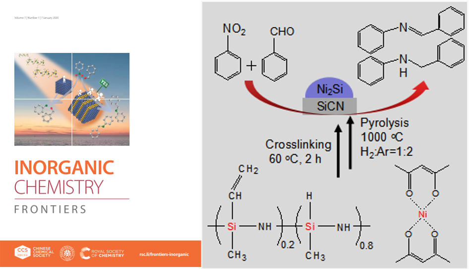 亚胺及其衍生物作为一类重要的中间体,在染料、香料、有机合成、光学材料、农药、医药等精细化学品中有着广泛的应用。通常,亚胺及其衍生物的合成是以酮或醛为原料经Lewis酸催化剂还原胺化,而胺的制备是基于对硝基芳烃的选择性还原。近期,基于绿色化学概念相对应的串联催化在提高化学合成效率方面引起了极大的兴趣,其将不同反应同时耦合在单个的反应容器中进行,有效避免了中间产物的分离和纯化并减少了能源利用。因此,开发一种既具有硝基芳烃选择性加氢功能,又具有醛胺催化偶联功能的高效催化剂是一锅串联合成亚胺和仲胺的关键。近期,大连理工大学精细化工国家重点实验室梁长海教授领导的先进材料与催化工程团队针对“一锅法”合成亚胺及其衍生物,开发了一种具有类贵金属性能的硅化镍催化剂,在硝基苯和苯甲醛的一锅还原偶联反应中表现出优异的催化活性和稳定性。相关工作发表在Inorg. Chem. Front., 2020, 7, 82上,并被选作前内封面予以报道。