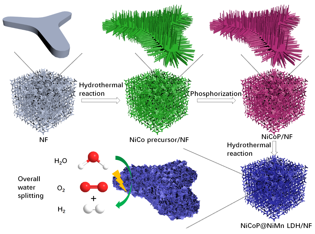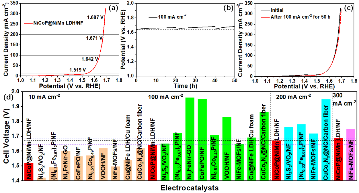 在此背景下,大连理工大学精细化工国家重点实验室梁长海教授领导的先进材料与催化工程团队合理地设计并合成了三维的、具有异质结构的NiCoP@NiMn LDH阵列水分解催化剂,并将其负载在泡沫镍上。该催化剂作为水分解的双功能催化剂,表现出了非常优异的活性:对于析氧反应,其仅需293、315和327 mV的过电势就能分别达到100、300和600 mAcm-2的电流密度;对于析氢反应,其仅需116、130和136 mV的过电势就能分别达到100、200和300 mAcm-2的电流密度;对于全水分解反应,其仅需1.519、1.642、1.671和1.687 V的就能分别达到10、100、200和300 mAcm-2的电流密度。此外,对于全水分解反应,能够在100 mAcm-2的电流密度下稳定50 h而活性没有明显的衰减。我们将这样高效的性能归结于以下3点:(1)NiCoP和NiMn LDH之间存在的异质结构不仅结合其各自的优点(对于析氢和析氧反应分别具有高活性)而且两相之间存在的界面效应形成了更多的活性位点并且加强了其电催化活性;(2)高导电性的NiCoP能够被作为快速的电子传输通道而加强电极的导电性;(3)具有三维网状结构的泡沫镍作为载体是有利于暴露更多的活性位点、确保产生的气泡及时排出和电子传输。