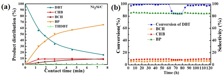 图3. (a)Ni2Si/C催化二苯并噻吩加氢脱硫随接触时间变化的产物分布图,(b)Ni2Si/C催化二苯并噻吩加氢脱硫的稳定性结果
