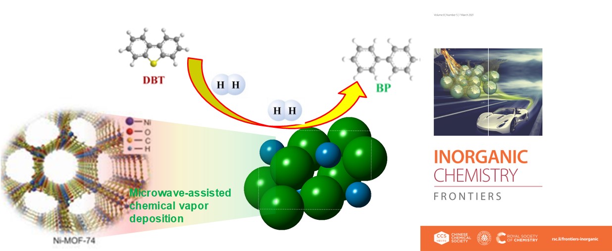近日,在梁长海教授指导下,张亮亮博士开发了一种绿色、可控的微波辅助化学气相沉积法,以Ni-MOF-74为镍源,二氯二甲基硅为硅源成功合成了Ni2Si/C催化新材料(如图1所示),并在含二苯并噻吩的模拟油品中探测了其超深度加氢脱硫性能。相关工作以Improving Hydrodesulfurization Performance of Sulfur-resistant Intermetallic Ni2Si Based on MOF-derived Route为题发表在Inorg.Chem.Front., 2021,8, 1122-1127,并以封面文章报道。