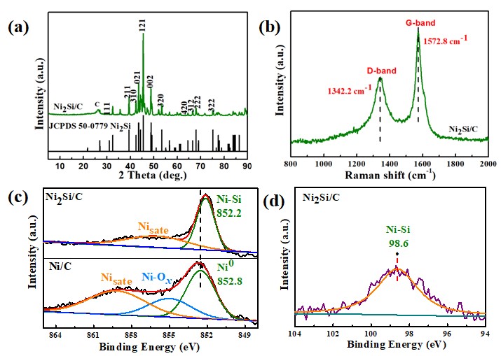 图2.(a)Ni2Si/C的XRD 谱图, (b)Ni2Si/C的拉曼谱图, (c)Ni/C和Ni2Si/C的Ni 2p XPS谱图, (d)Ni2Si/C的Si 2p XPS谱图