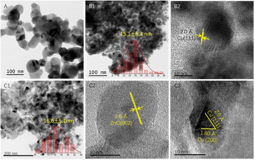 Figure 4. TEM images of Cu/ZnO (A), Cu/Al2O3 (B1-B2), and Cu/ZnO-Al1 (C1-C3) samples.
