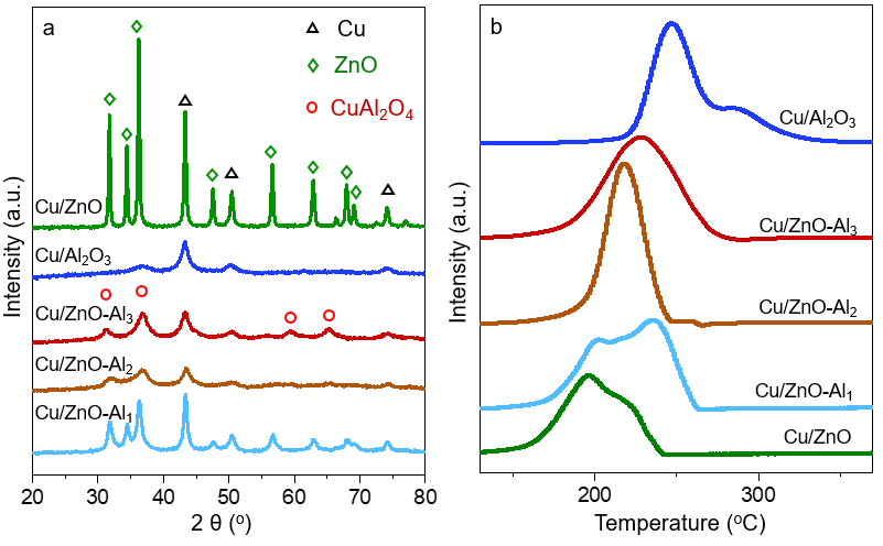 Figure 2. XRD patterns of Cu/ZnO-Alx samples after pre-reduction (a) and H2-TPR profiles of freshly calcined Cu/ZnO-Alx samples (b).