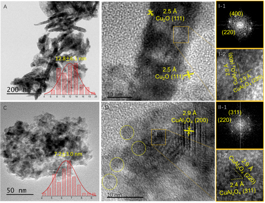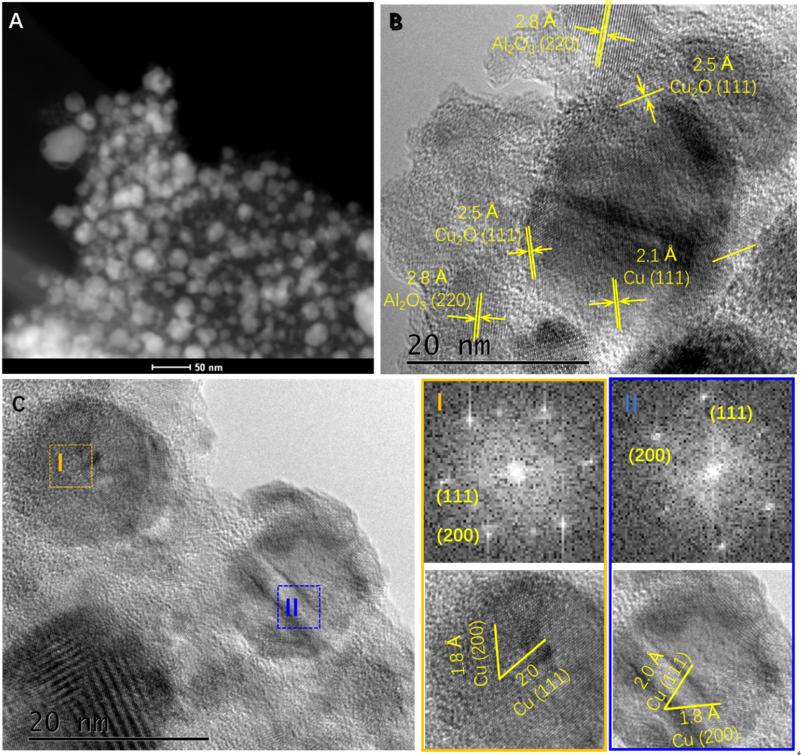 Figure 6. HAADF-STEM image (A) and TEM images (B-C) of Cu/ZnO-Al3 after circular reactions. The high-resolution TEM images and FFT transformations of area I and II are illustrated in the lower panel.