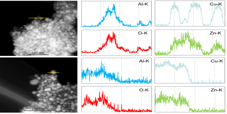 反应后 Cu/ZnO-Al3催化剂的线扫描结果再次证实,Al和O的信号保持一致,而 Cu 和 Zn 的信号峰形状相似,与 Al 和 O 的信号完全不同。说明反应后Al2O3与铜物种分离,生成Cu-Zn合金或具有Cu-Zn-Ox界面的双金属颗粒。