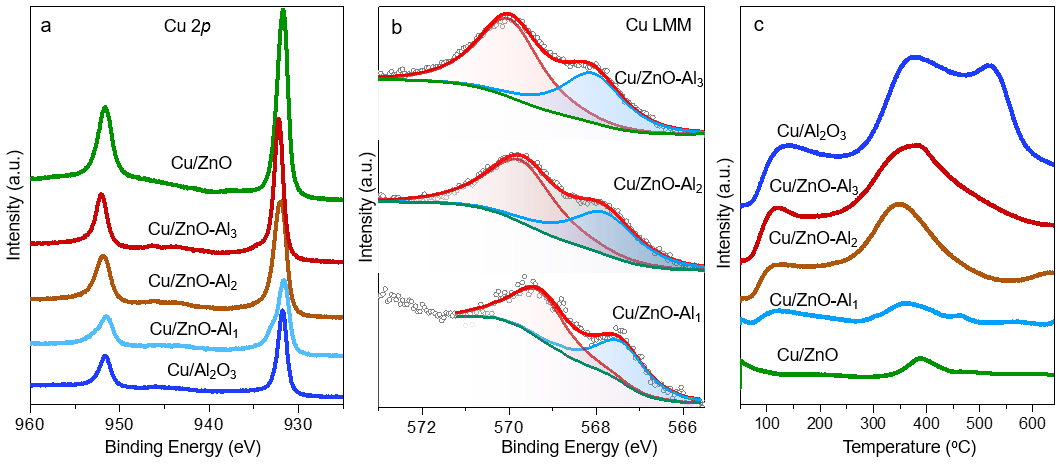 Figure 3. XPS spectra in the Cu 2p core level (a), Cu LMM spectra (b) and H2-TPD profiles (c) of Cu/ZnO-Alx samples after pre-reduction.
