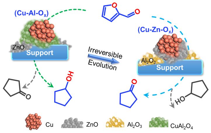 基于上述研究背景,近日,大连理工大学化工学院梁长海课题组构筑了具有不同Cu-M-Ox(M=Zn或Al)界面的Cu基催化剂,应用于糠醛水相加氢重排反应,作为环戊醇的关键和替代转化步骤。在预还原的Cu/ZnO-Alx催化剂中,Al在Cu活性中心表面富集。Zn和Al物种的协同作用,促进表面CuAl2O4尖晶石结构及Cu-Al-Ox界面的形成。特定的金属-载体协同作用和Cu-Al-Ox界面同时增强了催化剂的氧化还原性能,促进表面酸性位的生成,大幅度提升催化剂吸附/活化反应物分子的能力。同时,研究结果表明,Al2O3在反应过程中由Cu-Al-Ox界面析出,并被新的Cu-Zn-Ox 界面取代,是催化活性及环戊醇产率发生不可逆下降的根本原因。