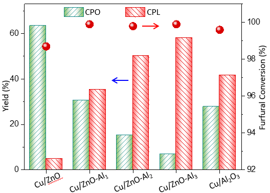 Figure 1. Catalytic performances of Cu catalysts for the hydrogenation-rearrangement of furfural. CPO: cyclopentanone, CPL: cyclopentanol. Reaction condition: 6 MPa H2, 160 oC for 1.5 h, catal./furfural = 15% (mass ratio), CPO: cyclopentanone, CPL: cyclopentanol.