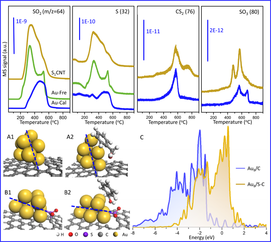 采用纳米金催化剂催化苯甲醇液相氧化反应是一种重要的苯甲醛绿色合成方法。然而,由于Au-C间较弱的相互作用,以碳材料为载体时Au颗粒在载体表面分散性差、稳定性不佳、极易在制备及反应中失活。因此,通过有效手段构建Au-C间强相互作用,针对苯甲醛高选择性及催化剂稳定性,提出催化剂的新型研发路径,对催化材料及工艺的可持续应用具有重要的战略意义。近日,大连理工大学梁长海教授团队利用Au特殊的亲硫性,可控调节Au-C相互作用及界面电荷传递效应,将2.6 nm的金颗粒负载于磺化碳管表面,获得了苯甲醇氧化反应显著的催化活性及循环稳定性。