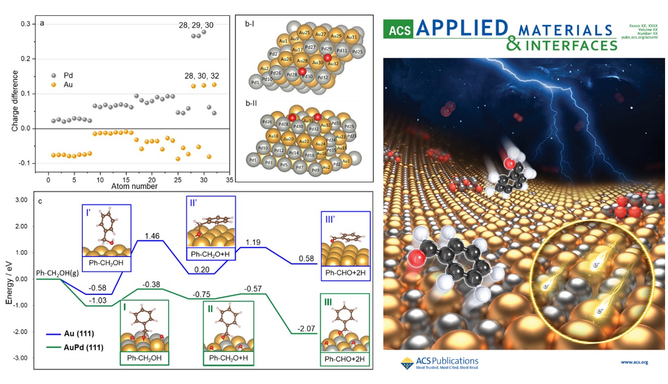 XRD衍射图像分析及球差STEM图像的分析结果显示,双金属纳米颗粒主要由AuPd合金组分构成。经过氧化气氛中300 ⁰C焙烧处理,合金颗粒中出现Pd相分离,并在表面形成无定型的PdO纳米碎片,在双金属颗粒表面观测到明显的晶格膨胀现象及属于PdO的晶格条纹;XPS结果同时证实Pd元素随着Au/Pd原子比下降在表面规律性富集。采用DFT模拟计算对AuPd双金属位点间的电子环境及无碱条件下的反应机制进行解析。证实Au-Pd双金属颗粒表面形成由Pd向Au表面转移电子的配对活性位点,调整苯甲醇在金属活性位点表面的吸附构型、降低反应能垒、促进苯甲醛产物的选择性合成。表面PdO碎片作为活性氧物种的运载体完成活化补充氧物种的循环过程。