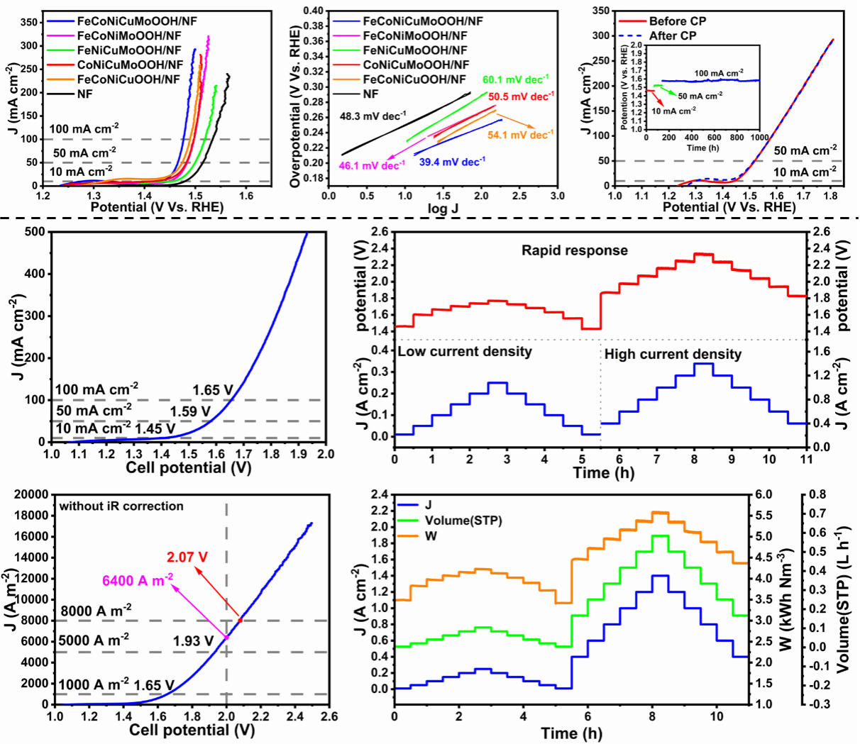 所开发的高熵羟基氧化物催化剂具有在工业规模水分解反应中应用的潜力,为实现清洁能源的大规模生产提供了新的可能性。在工业条件下的全解水测试结果表明,FeCoNiCuMoOOH催化剂不仅具有较低的槽压和产氢能耗,而且具有超高的机械稳定性和结构完整性。