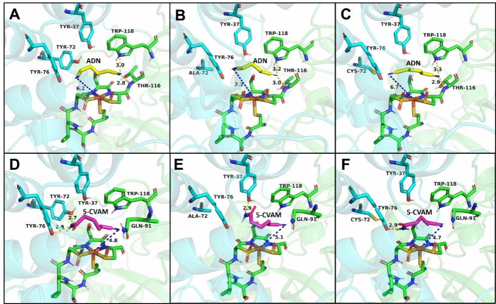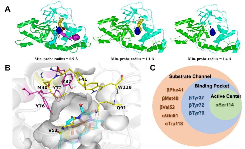 再通过对比酶突变前后底物通道的构象变化、结合口袋的体积变化,分子对接与分子动力学模拟对于酶与底物(包括ADN与5-CVAM)之间相互作用的计算分析,详细讨论了两种突变体是如何通过影响酶自身结构以及与底物之间的相互作用,实现了对5-CVAM区域选择性的提升。