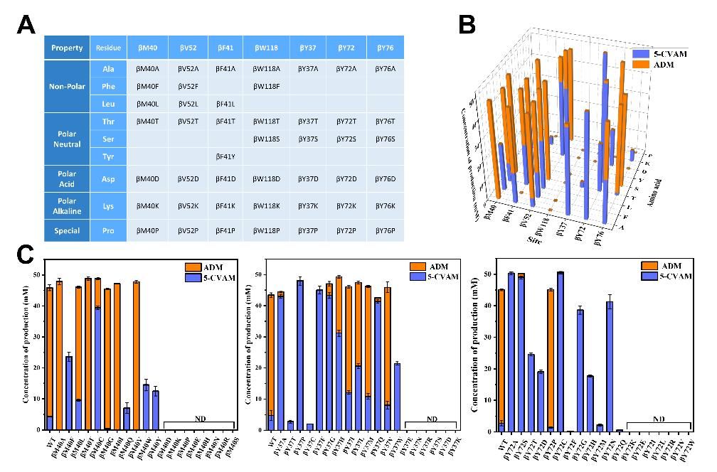 针对上述问题,研究团队提出了基于半理性设计的酶工程化改造策略实现对ReNHase区域选择性进行调控。基于半理性设计预测并得到了位于ReNHase底物通道和结合口袋的重要残基,在剔除高度保守和影响酶活性的残基位点后建立了突变体文库。进行筛选并进行酶动力学参数表征后,锁定了能够调控催化ADN反应产物区域选择性的关键位点βTyr72,并且得到了对于5-CVAM区域选择性分别为96%和100%的突变体βY72A和βY72C。