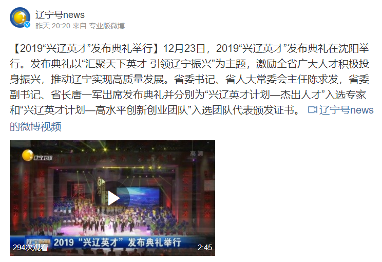 新闻链接 辽宁省:2019年“兴辽英才计划”入选人才与团队名单出炉!
